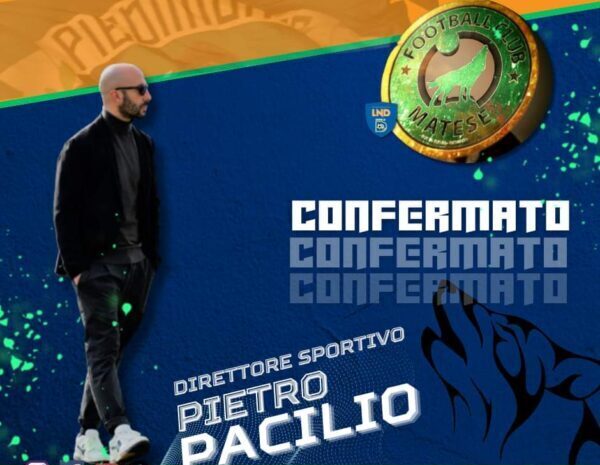 Pietro Pacilio confermato Direttore Sportivo dei lupi matesini anche per la prossima stagione. L’esperto dirigente di Alife, che ha saputo conquistarsi anche sul campo, oltreché dietro la scrivania, la fiducia della FC Matese, presterà il suo servizio per la squadra matesina, dunque, pure per il prossimo anno che andrà fra qualche mese ad iniziare.