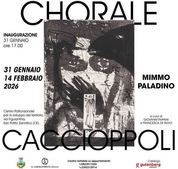 Il 31 gennaio 2026 alle ore 17.00, con il patrocinio del Comune di San Potito Sannitico (Ce), negli spazi del Centro Polifunzionale per lo sviluppo del territorio, via Figulantina, San Potito Sannitico (CE), sarà inaugurata la mostra Mimmo Paladino. Chorale Caccioppoli con la direzione artistica di Giovanni Timpani.