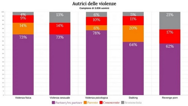 Ma prima un po’ di dati. Dall’indagine è emerso che il 68% degli intervistati è stato vittima di violenza fisica, il 38% di violenza sessuale, l’81% di violenza psicologica, il 53% di stalking e il 7% di revenge porn. In tutte le categorie le autrici sono soprattutto partner o ex partner, ma non di rado il loro podio è insidiato da familiari. Le testimonianze a testo libero parlano frequentemente di madri e sorelle maltrattanti talvolta oltre il limite della crudeltà. «Mia madre ha tentato di buttarmi dal balcone quando avevo 7 anni», racconta un anonimo.
