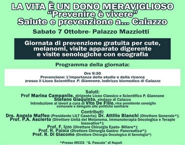 Ecco l’appuntamento: “La vita è un dono meraviglioso”. La giornata che avrà inizio presso il Liceo Biomedico “P. Giannone”, in via P. Cervo, alle ore 9:30 col convegno dal titolo “Prevenzione: l’importanza dello studio e della ricerca”, dove si vedranno quali relatori: Drs. Angela Maffeo (Presidente LILT Caserta); Dr. Attilio Bianchi, quindi l’attesissimo il Prof. Paolo. A. Ascierto, Prof. F. Izzo Prof. R. Di Giacomo, direttori, questi ultimi, presso l’ IRCCS “G. Pascale” di Napoli.