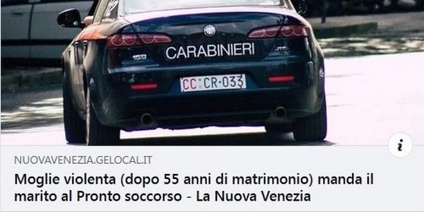 Donne violente. Moglie violenta (dopo 55 anni di matrimonio) manda il marito al Pronto soccorso: la denuncia del marito raccolta dai carabinieri.